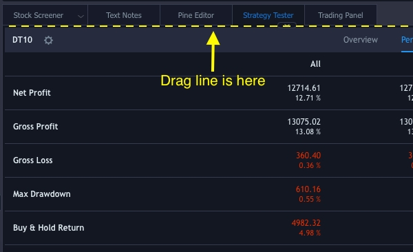 Перетащите верхнюю часть панели «Тестер стратегий» туда, где вы можете увидеть «Чистую прибыль» и «Buy & Hold Return».