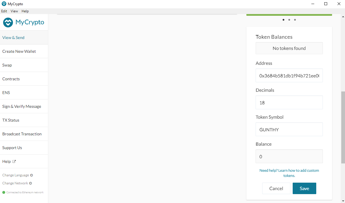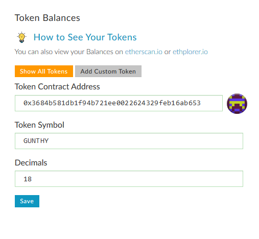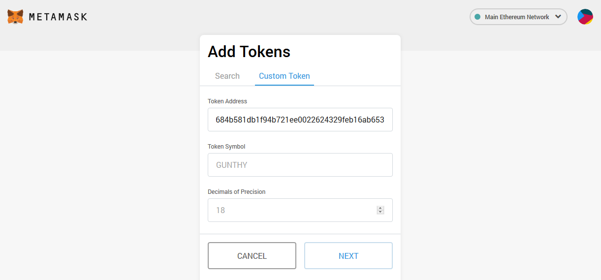 Enter the GUNTHY token contract address, as well as the token symbol (GUNTHY) and the number of decimals (18).
