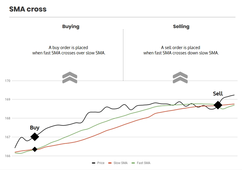 This strategy is based on SMA, enabling Gunbot to buy when prices start moving up - indicated by fast SMA crossing over slow SMA. Selling takes place as soon as fast SMA crosses down slow SMA.